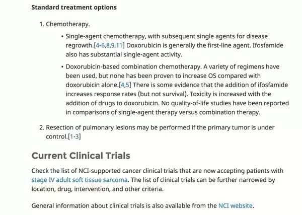 点进去可以看到针对不同分期的软组织肿瘤的标准化的治疗意见,以及正在进行的相关临床试验。