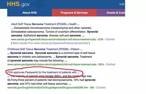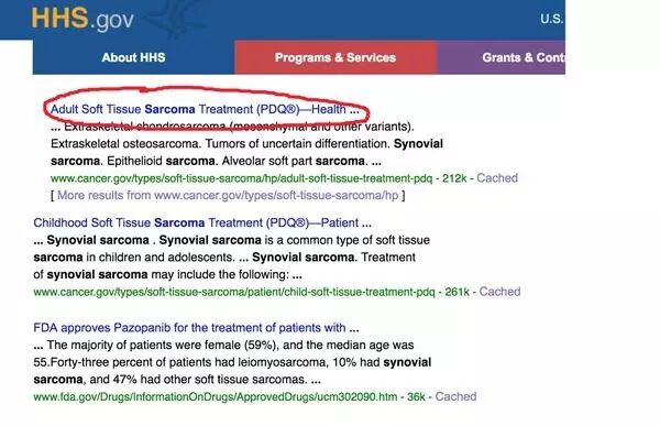 但如果我登录美国卫生及公共服务部HHS.gov,搜索关键词“Synovial sarcoma”(滑膜肉瘤)。